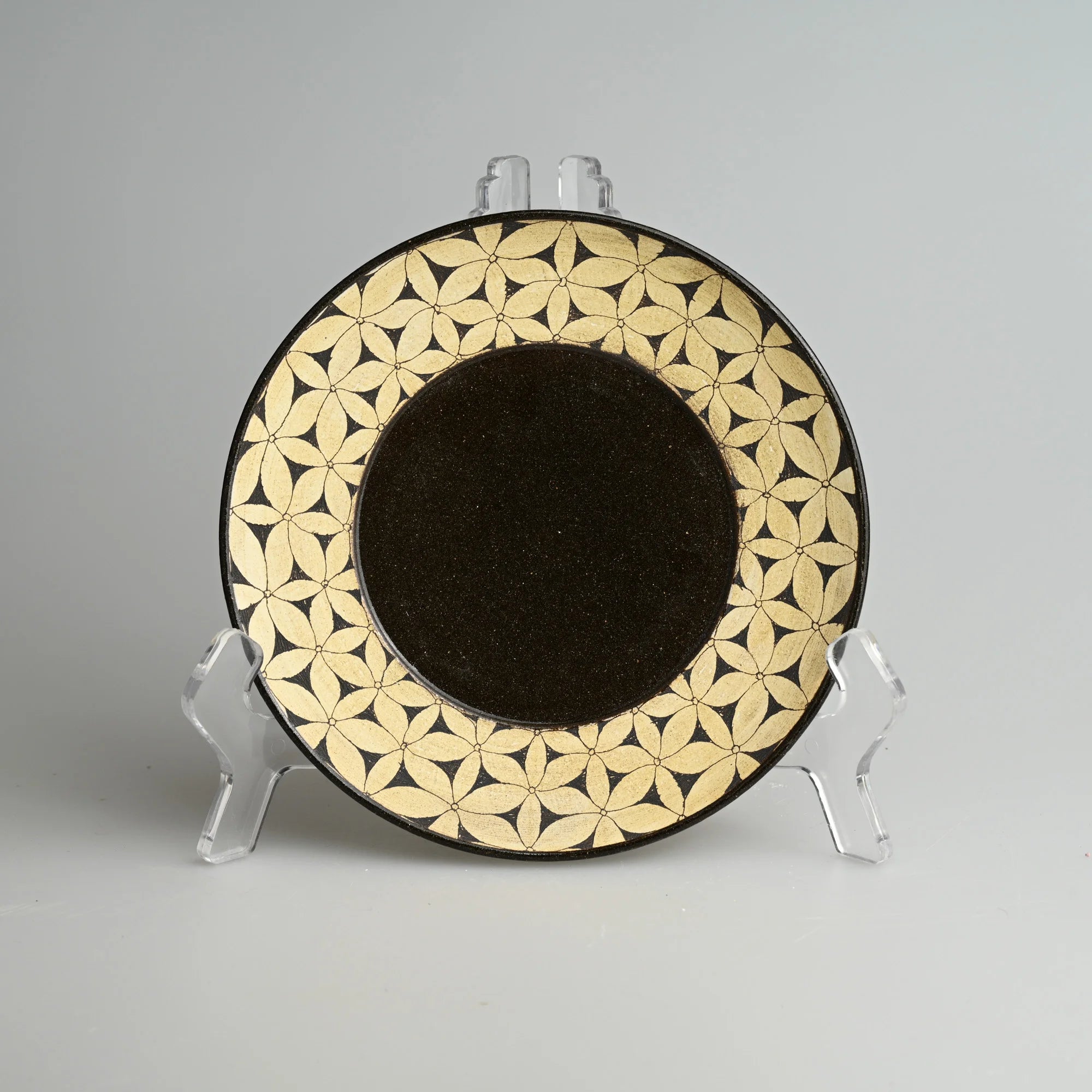 A shallow ceramic plate featuring the Shadow Floral hand-carved motif, with a dark glazed center framed by finely engraved geometric petals.