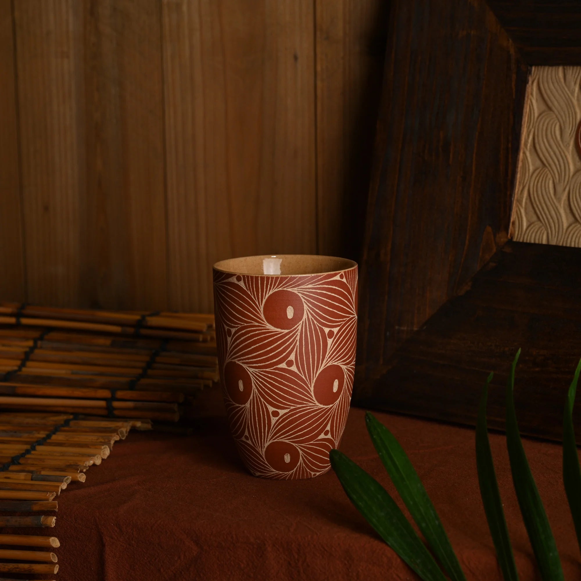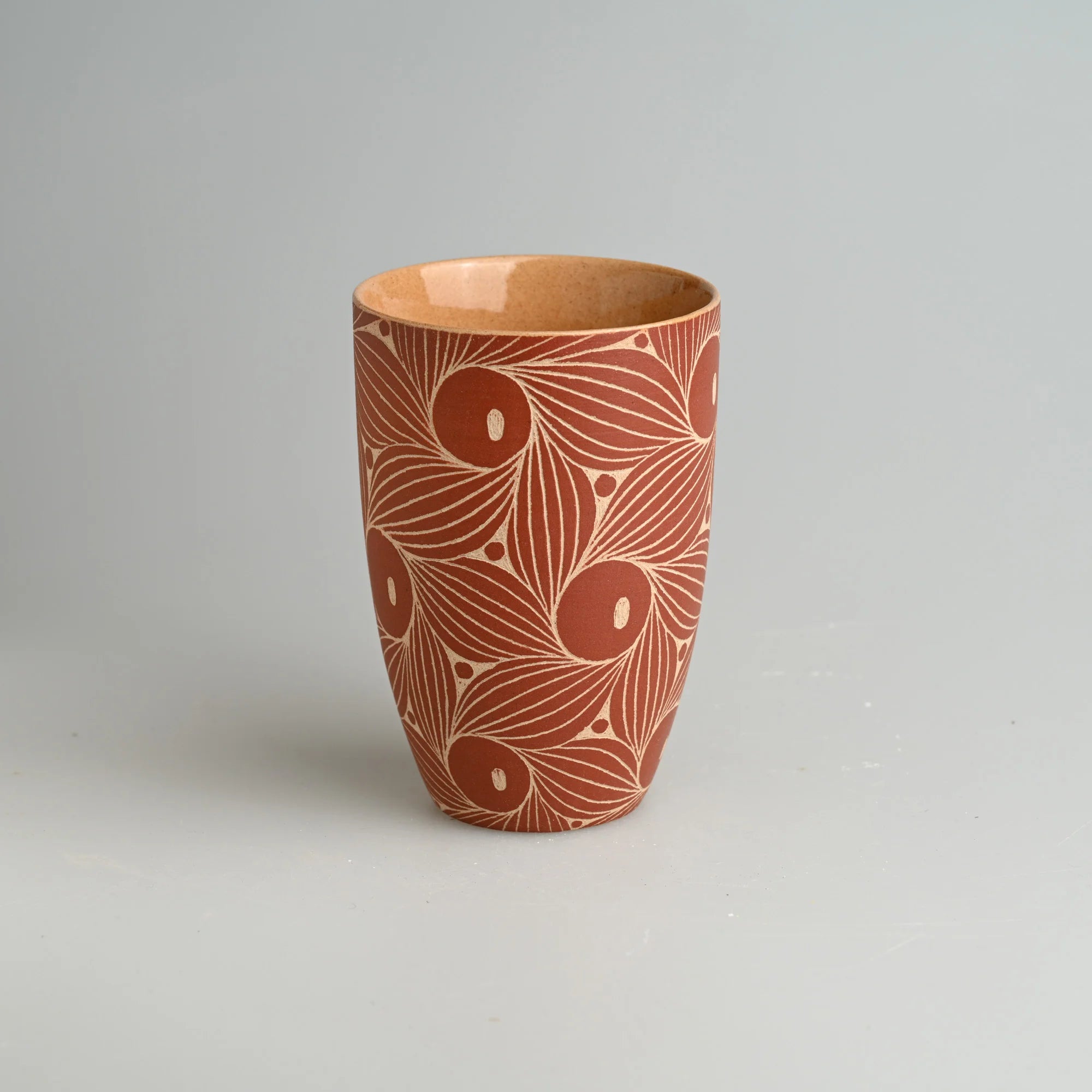 A handcrafted ceramic tumbler featuring intricate floral carvings on warm Jingdezhen traditional clay.