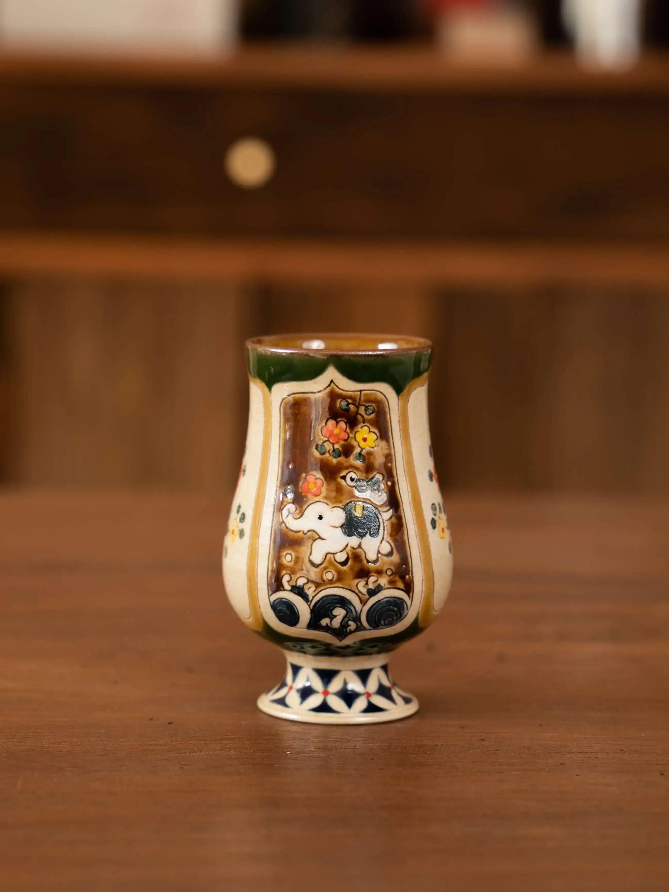 The tall, narrow form gathers warmth in the hand, while the small opening softens the experience of aroma and taste. At the center, an elephant moves quietly among flowersβgentle, steady, and close.