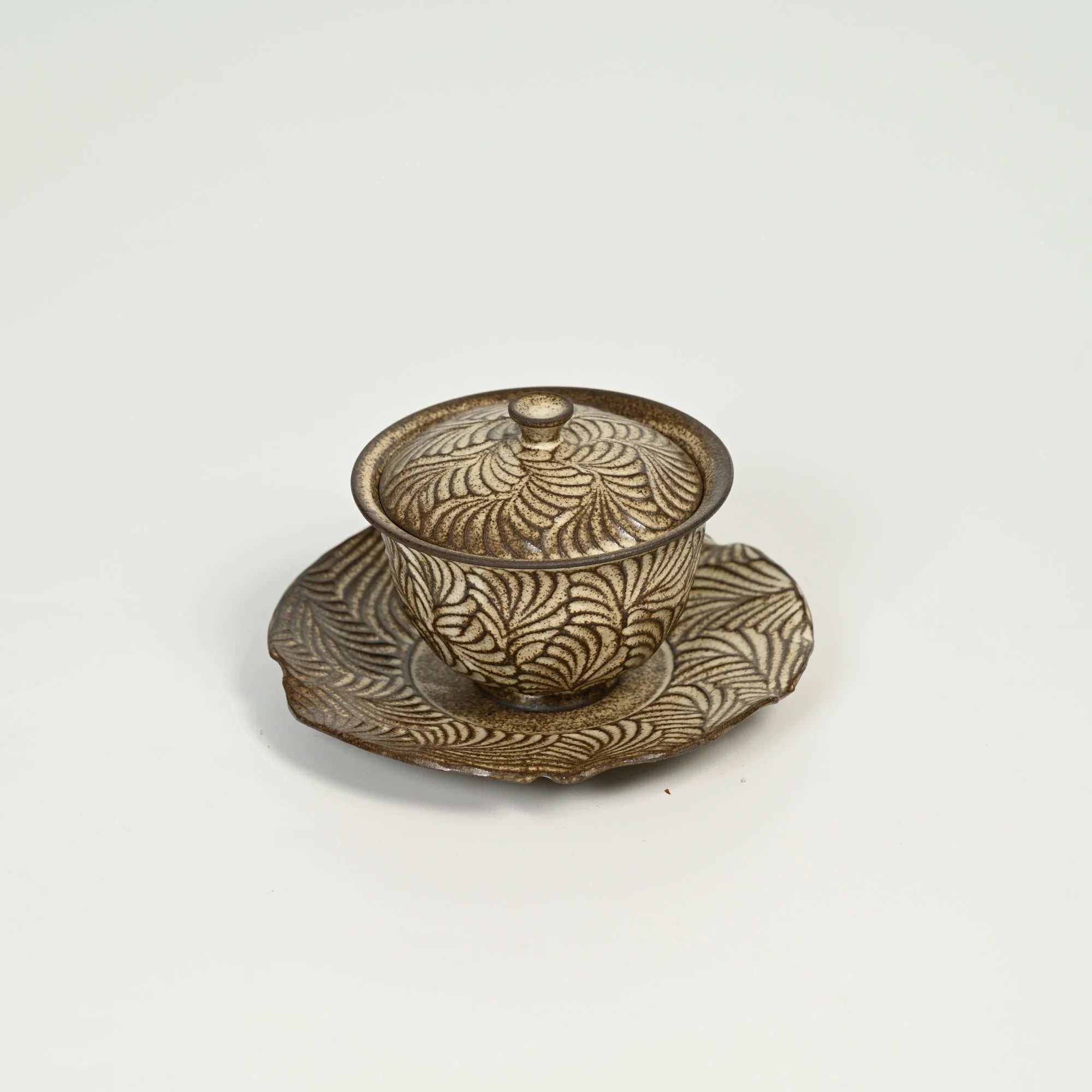 This gaiwan set is shaped with gentle curves, its cup, lid, and saucer united by the same flowing carved lines that define the Gathered Drift series. The patterns move softly across the surface, creating a sense of rhythmic texture that feels calm to the eye and grounding to the touch. The flared rim, snug lid, and sculpted base plate offer a balanced, steady feel—suited for quiet tea rituals where warmth, movement, and touch come together in a single, attentive moment.