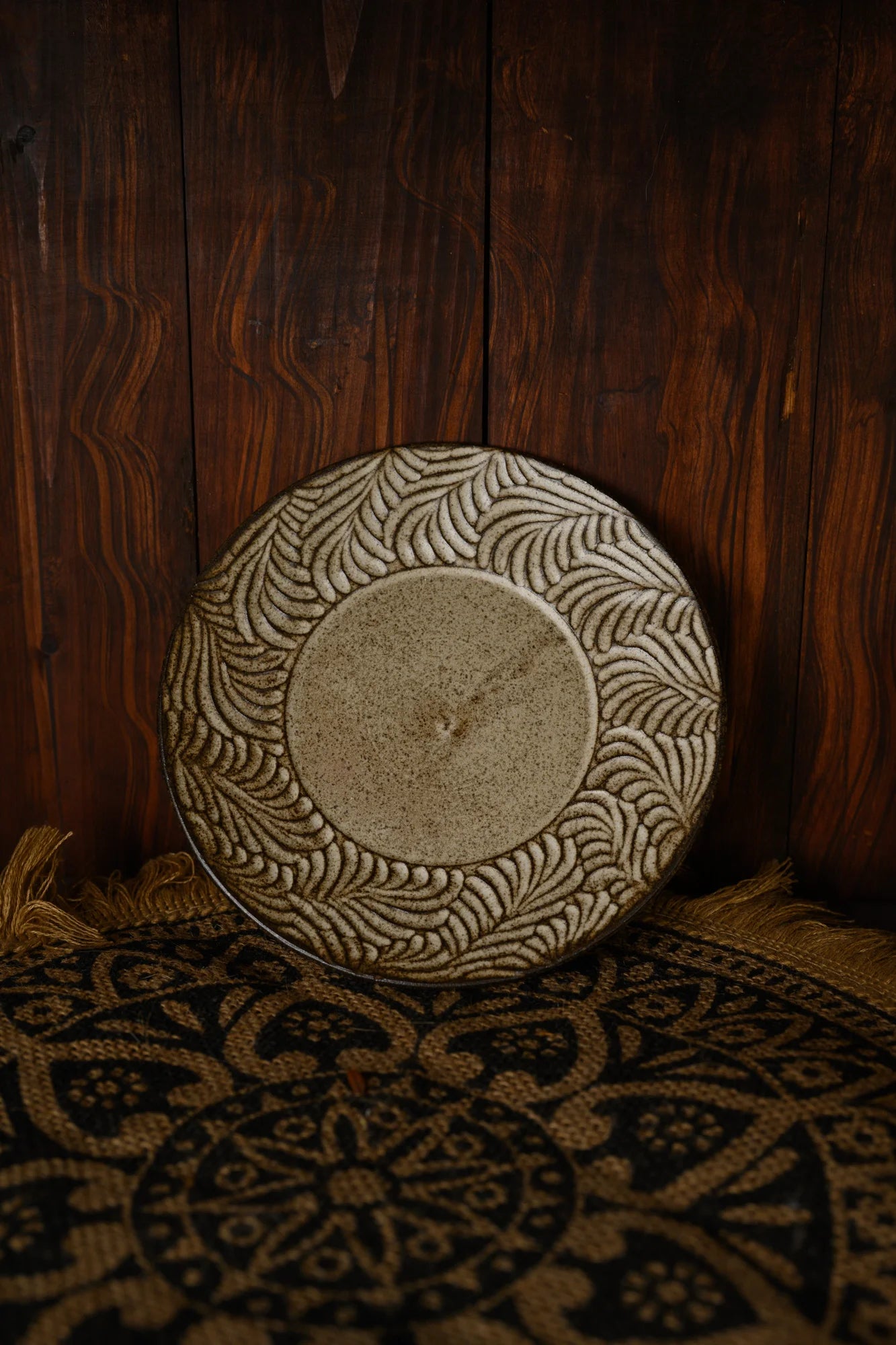 This shallow plate features a ring of flowing carved lines that frame the smooth central well, creating a gentle sense of movement across the surface. The subtle gradient from light to dark adds depth without feeling heavy, while the lightly curved rim gives the piece a quiet, balanced presence. With its soft texture and grounded earth tones, the plate suits tea snacks, desserts, or daily table use, offering a calm, hand-shaped warmth to any setting.