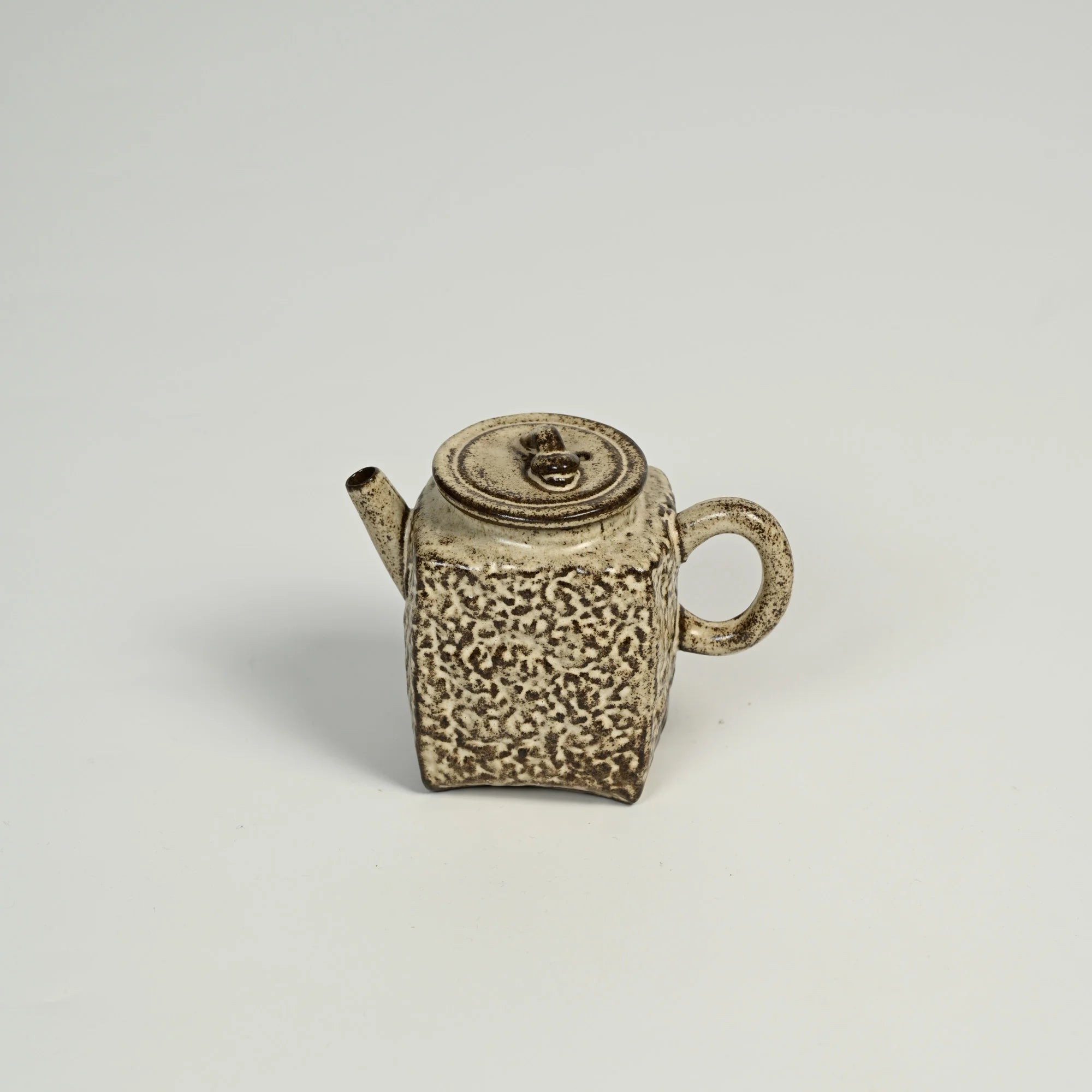 This small square teapot carries a quiet, contemplative presence. Its softly textured surface—formed by densely carved, pebble-like patterns—gives the piece a grounded tactility, while the upright body and rounded handle create a calm, steady silhouette. The lid’s sculpted knob adds a subtle point of focus, echoing the vessel’s intimate scale. Designed for slow, personal brewing moments, it brings a sense of earthy stillness to the table, whether used for tea or simply admired as a thoughtful object.