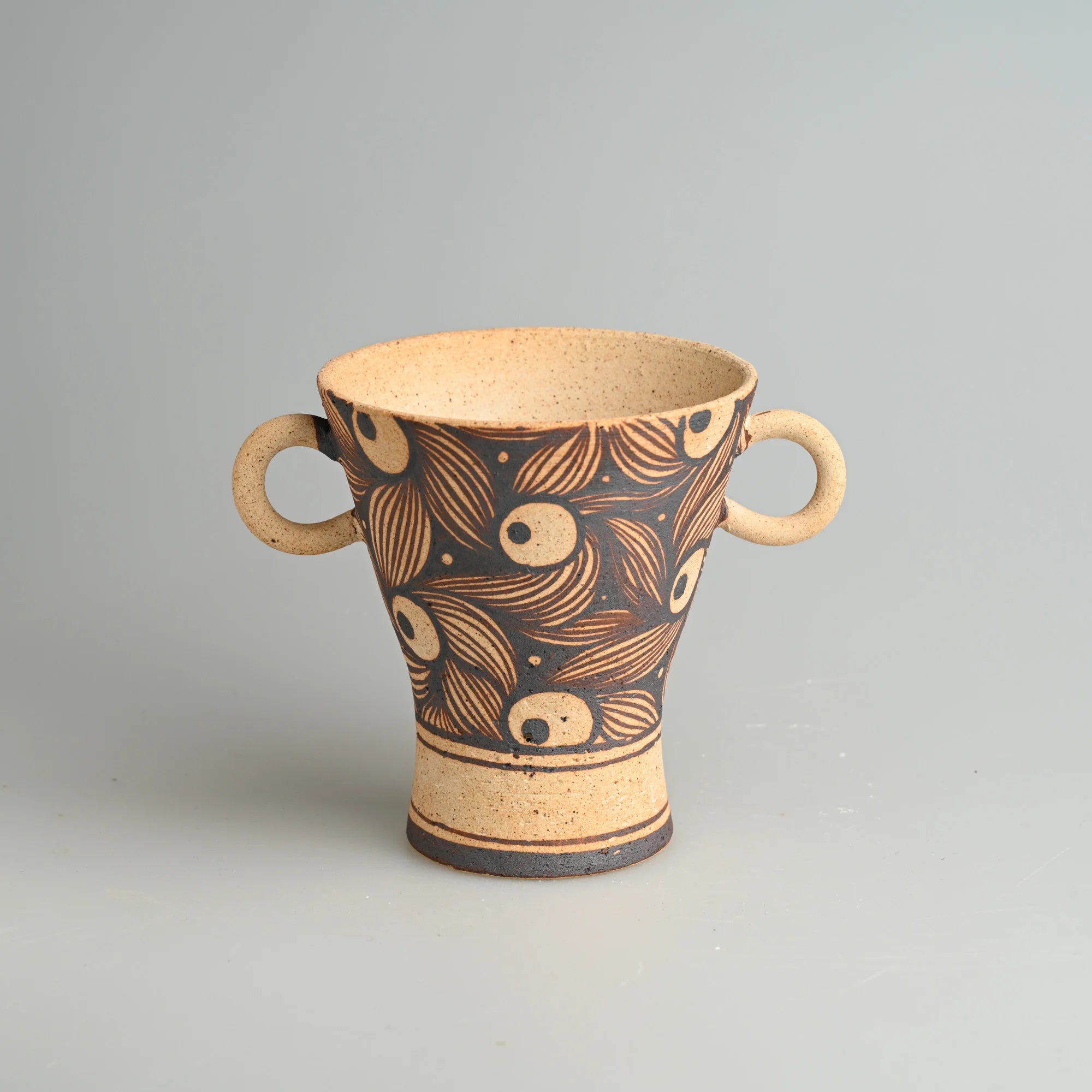 Each piece is hand-carved and colored in Jingdezhen, shaped from dark or pale clay mixed and refined in the studio. The patterns come from ancient Yangshao pottery—simple curves and flowing lines once drawn on earth-toned vessels. Fired at 1240 °C, the clay becomes dense and clear in tone, its surface holding both the mark of the tool and the calm of the fire. TriFire’s work carries the still rhythm of old craftsmanship, quiet yet alive.