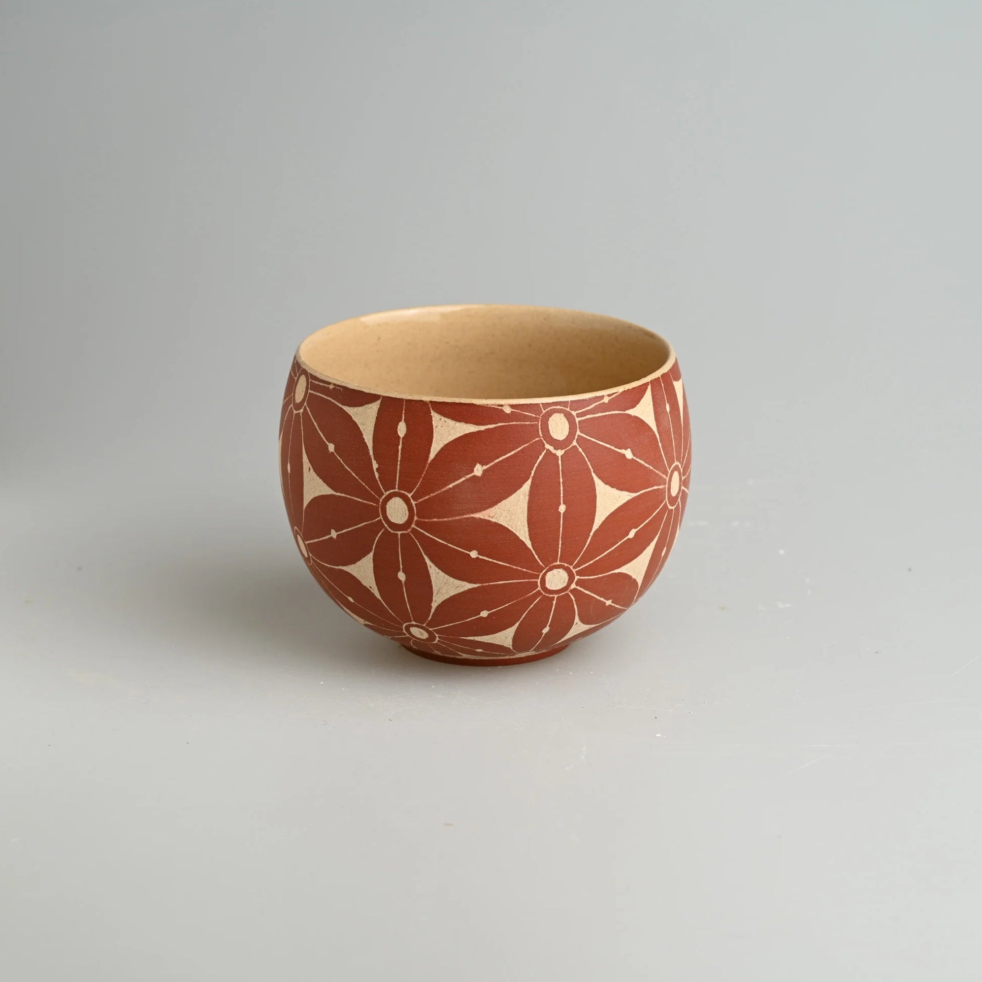 A handcrafted ceramic cup featuring delicate floral carvings on warm, earthy Jingdezhen traditional clay. The intricate design, with its repeating floral motifs, brings ancient ceramic traditions to life, blending timeless beauty with modern elegance. The Earthen Floral series highlights natural textures and earthy tones, making each piece a unique expression of traditional craftsmanship.