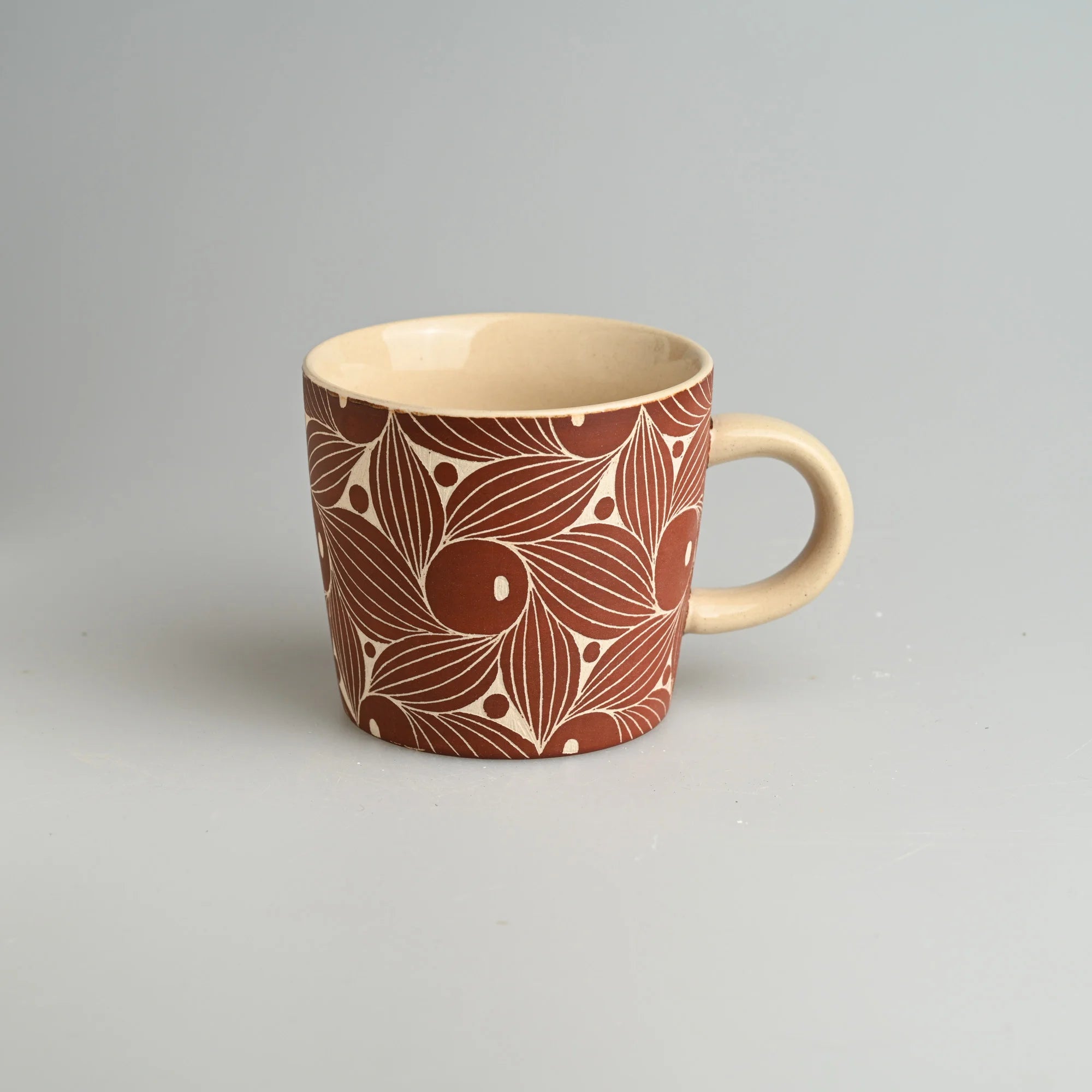 A handcrafted ceramic mug featuring delicate floral carvings on warm Jingdezhen traditional clay. The design evokes the timeless beauty of ancient pottery, blending traditional craftsmanship with modern elegance. The earthy tones and tactile texture make each piece unique, with the Earthen Floral series bringing nature-inspired motifs to life.