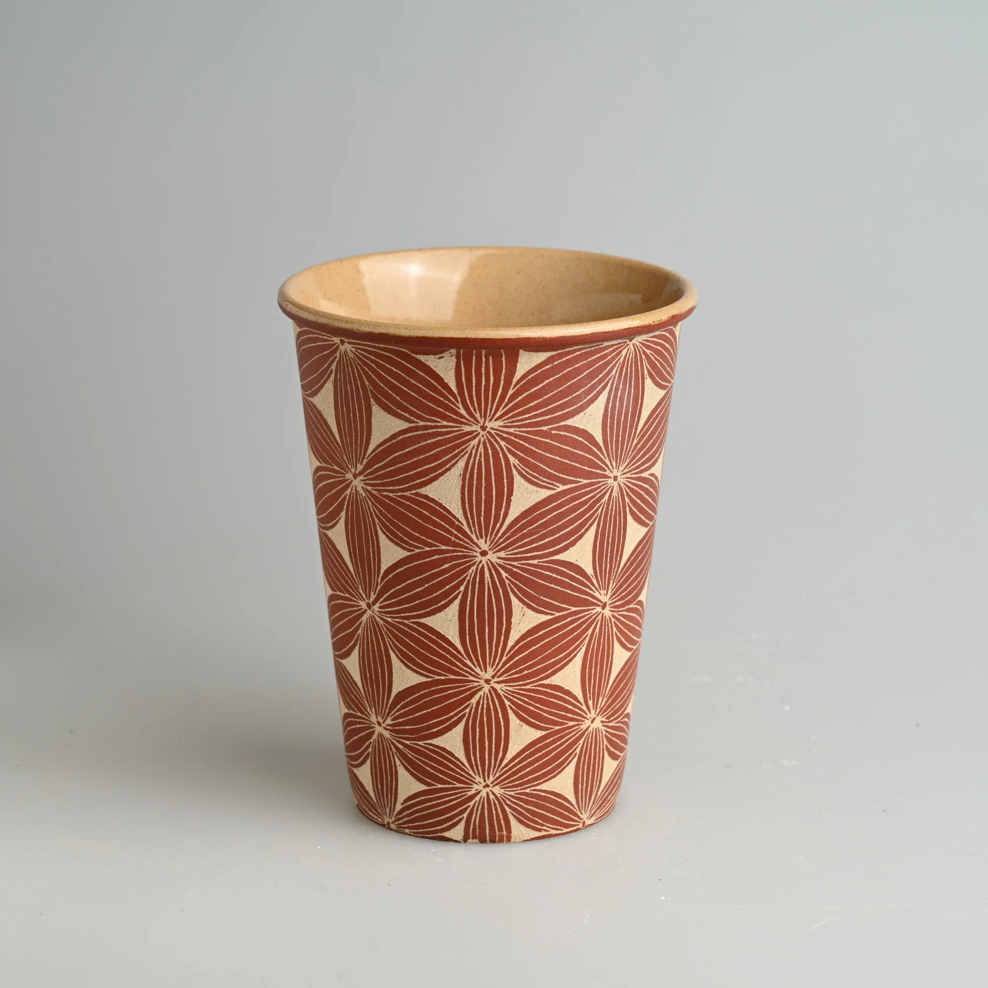 A handcrafted ceramic tumbler featuring delicate floral carvings on warm Jingdezhen traditional clay.
