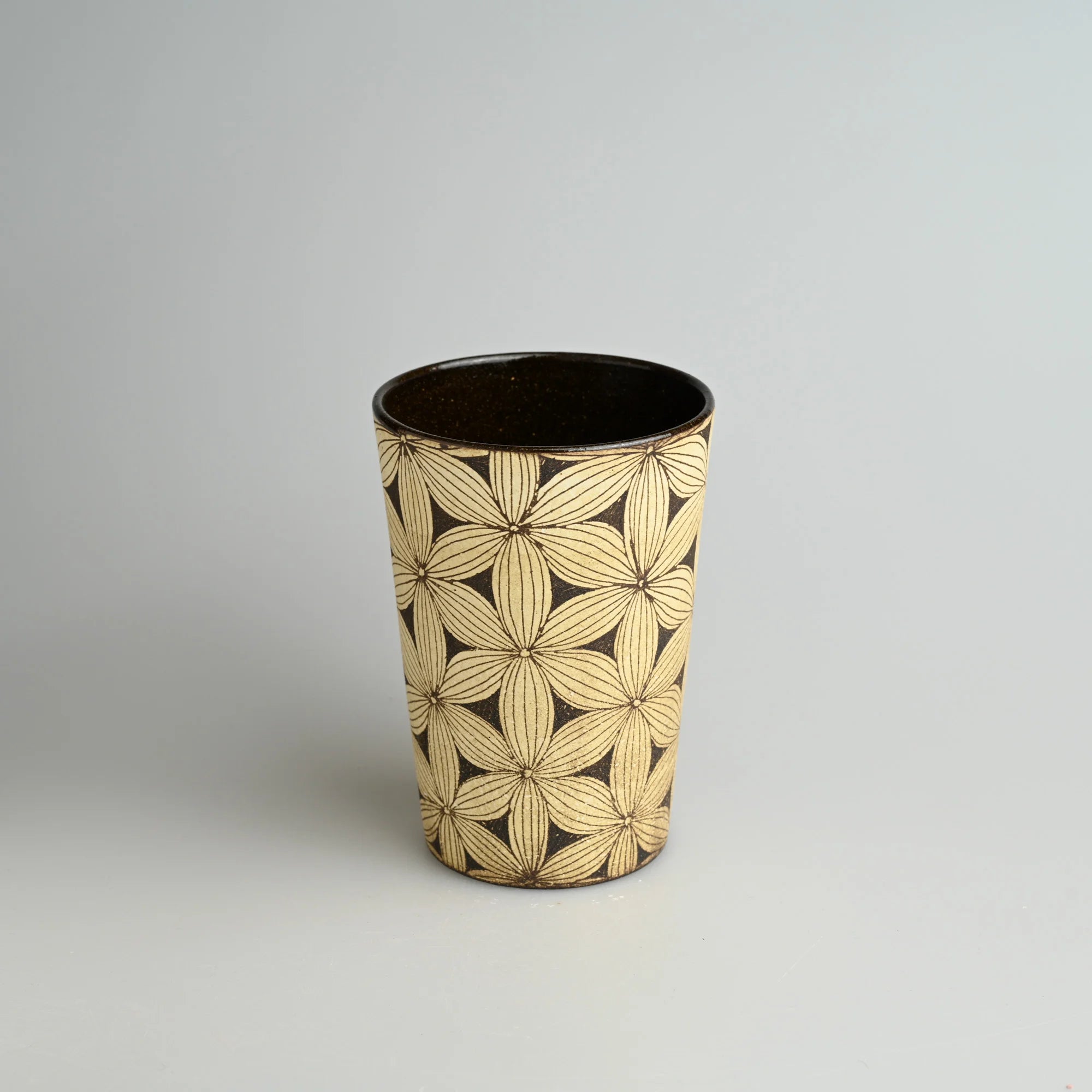 A tall ceramic tumbler featuring the Shadow Floral hand-carved pattern with a dark glazed interior.