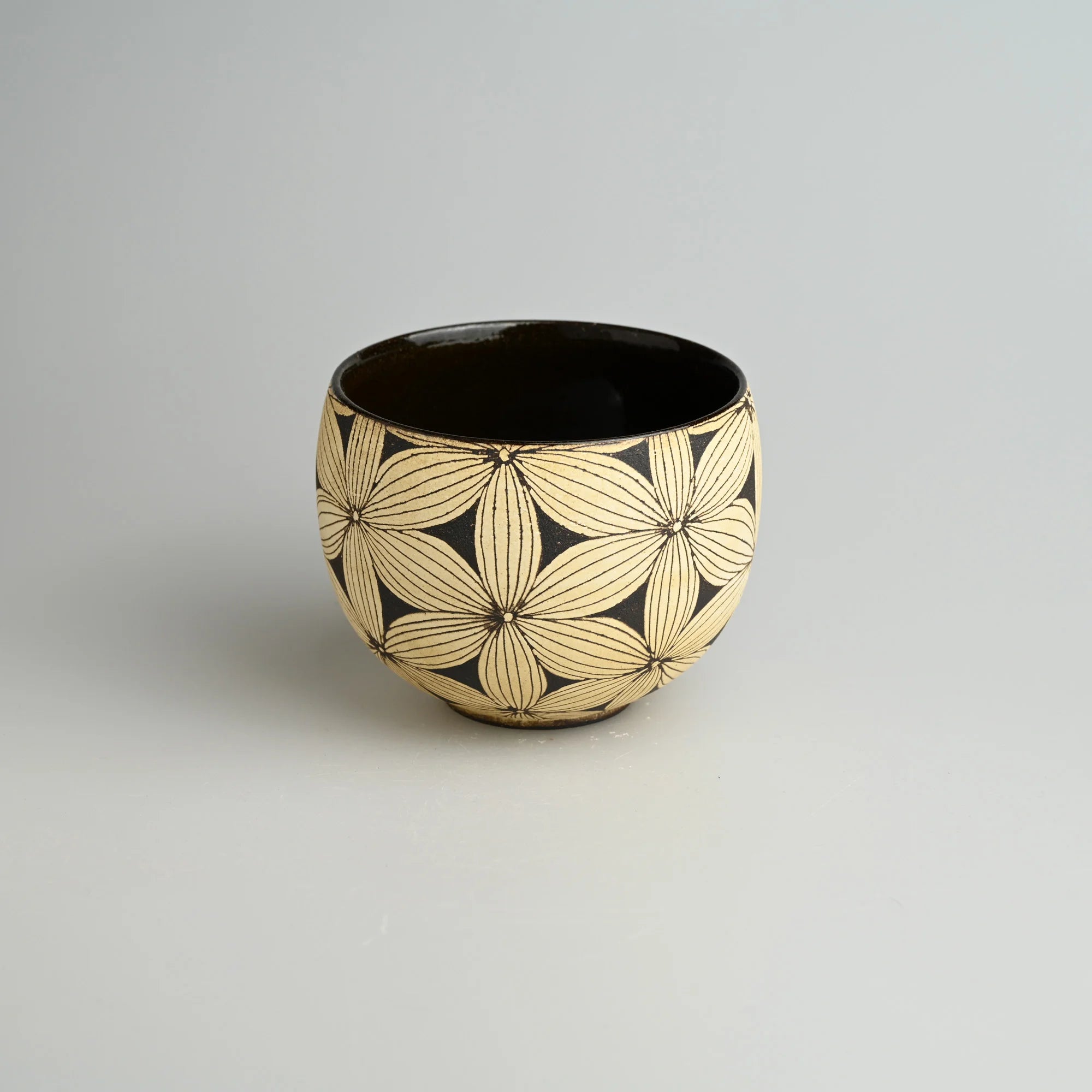 A handcrafted ceramic cup featuring full-surface Shadow Floral carvings set against a deep dark clay base. The rounded form gives the piece a gentle presence, while the pale carved petals contrast softly with the glossy interior, creating a balanced and tactile visual rhythm.