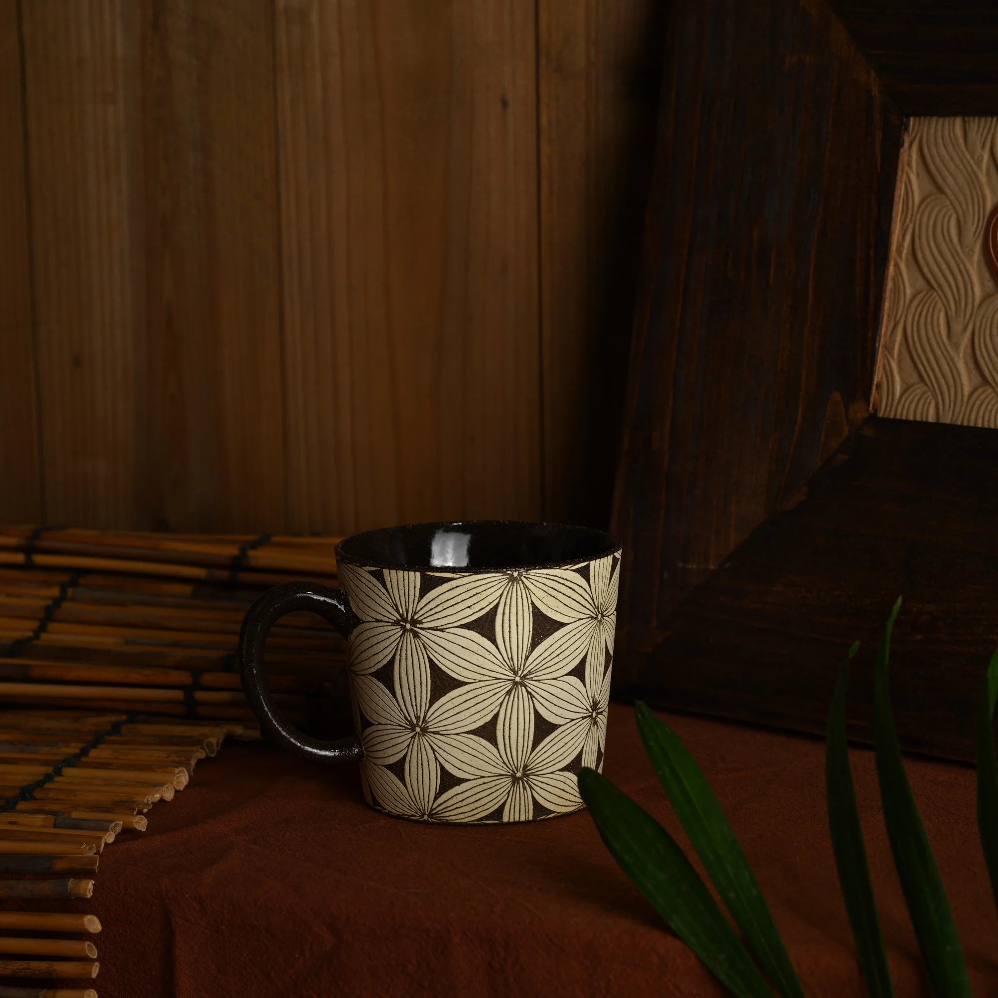 A handcrafted ceramic mug featuring dense, hand-carved floral patterns over deep clay, contrasted by a smooth and glossy dark interior. The generous handle and upright form give it a grounded, balanced presence while highlighting the expressive Shadow Floral carving.