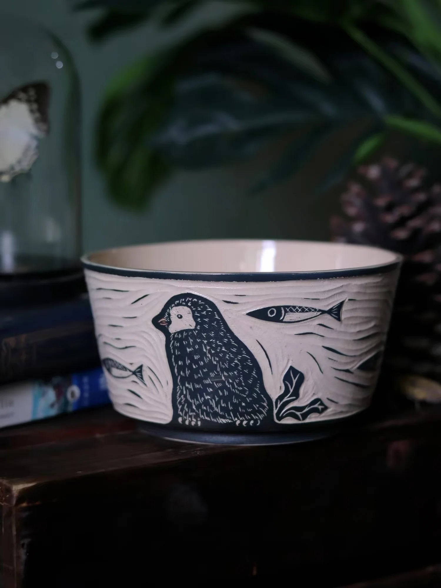 WhaleSong Studio’s hand-carved bowl featuring a group of penguins gathered closely together, their forms layered and steady, shaped by cold waters and shared presence.