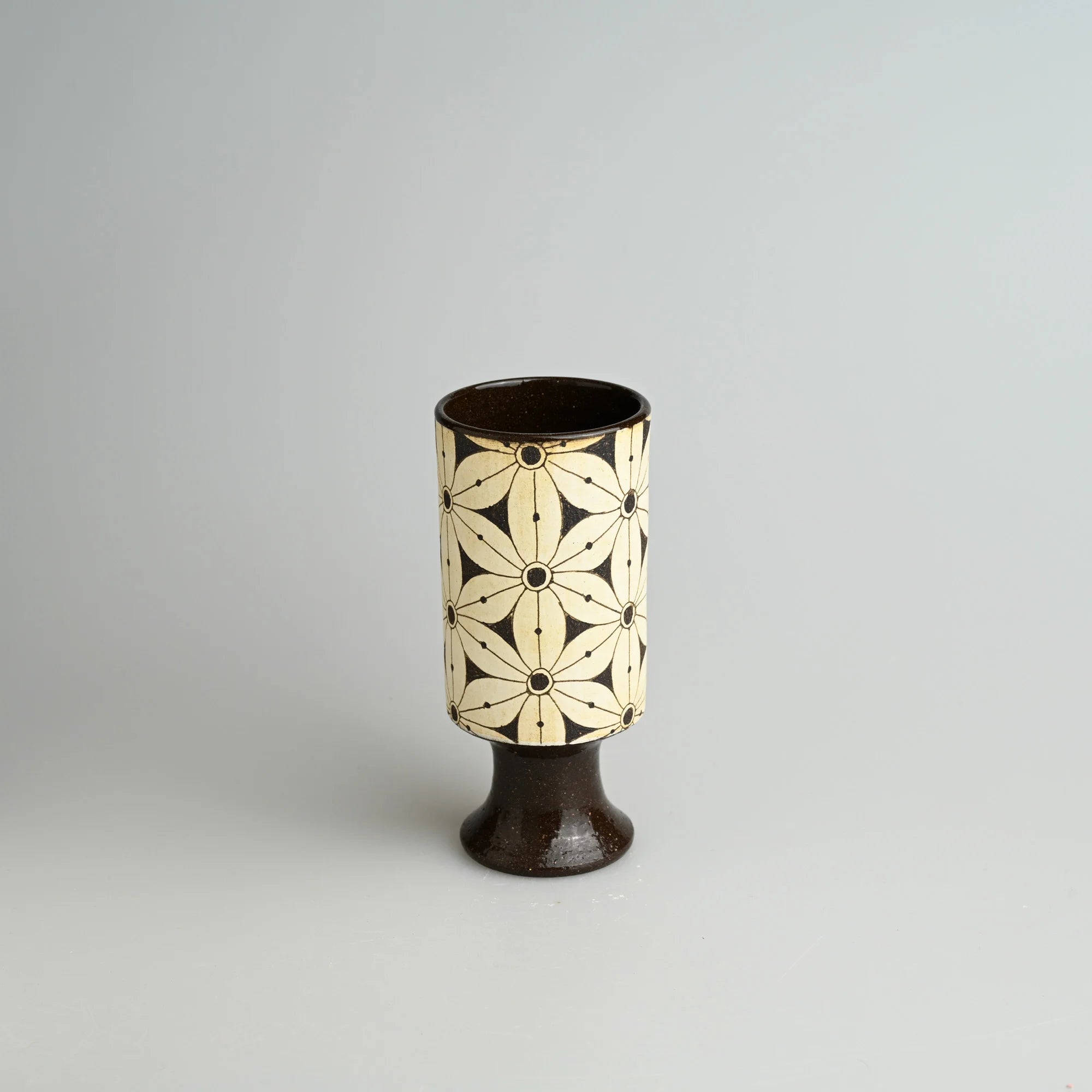 A handcrafted ceramic goblet featuring intricate floral carvings contrasted against a deep, dark clay body, highlighting the signature Shadow Floral aesthetic.